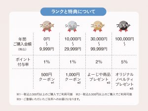 よーじやアプリや公式オンラインショップ内で会員登録するだけで加入でき、年間購入金額に応じたランクによりお得な特典を受けることができます。