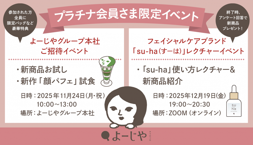 日頃のご愛顧へ感謝を込めて 「よーじやメンバーズ 」のプラチナ会員さま限定イベントを2025年11月24日(月・祝)と12月19日(金)に開催いたします。11月には、8名さま限定で弊社初となるよーじやグループ本社にご招待。新商品のお試しや新作パフェの試食など当イベントだけのプログラムをご用意しております。また、12月には30名さま限定で、新商品がもらえる!フェイシャルケアブランド「su-ha(すーは)」のレクチャーをオンラインで開催いたします。よーじやは今年3月に「おみやげの店」から「おなじみの店」を目指しリブランディングを実施いたしました。今後も「よーじやメンバーズ」をはじめ、すべてのお客さまに、より一層ご愛顧いただけるよう、さまざまな取り組みを展開してまいります。